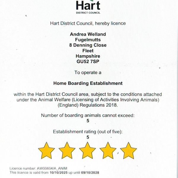 I have a recognised First Aid Qualification which is renewed regularly to ensure your dog is safe whilst in my care.